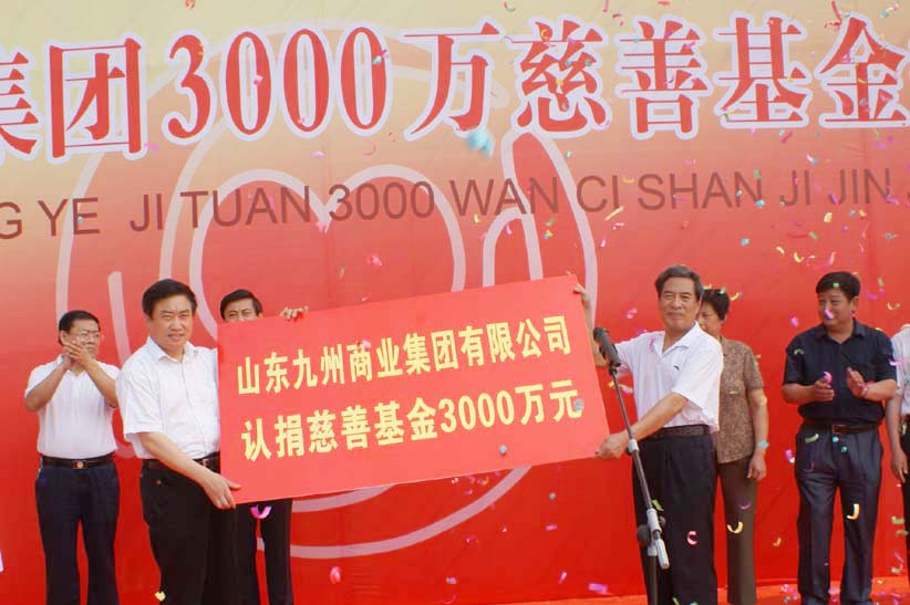6月5日,臨沂市慈善總會(huì)為集團(tuán)舉行了“山東九州商業(yè)集團(tuán)3000萬慈善基金捐贈(zèng)儀式”。臨沂市慈善總會(huì)會(huì)長、市政府副市長左沛廷,慈善總會(huì)常務(wù)副會(huì)長、民政局長姜新利,慈善總會(huì)副會(huì)長、集團(tuán)董事長楊本渠,慈善總會(huì)副會(huì)長兼秘書長、民政局副局長朱步君,以及集團(tuán)領(lǐng)導(dǎo)副董事長兼黨委書記張素芬、總經(jīng)理?xiàng)钜食、黨委副書記王佐文等出席捐贈(zèng)儀式。 此次認(rèn)捐3000萬元慈善基金,是集團(tuán)在去年向市慈善總會(huì)認(rèn)捐200萬元,設(shè)立“九州慈善基金”的基礎(chǔ)上追加的。隨著追加額度的增加,救助范圍也逐步的擴(kuò)大,從去年的用于助學(xué)擴(kuò)大到走訪困難群眾和其它全市慈善救助項(xiàng)目。多年來,集團(tuán)在自身不斷發(fā)展壯大的同時(shí),牢記報(bào)效國家、回饋社會(huì)、投身公益的使命,積極參與各類助學(xué)、助殘、救災(zāi)、濟(jì)困等公益活動(dòng)。集團(tuán)累計(jì)捐款捐物達(dá)數(shù)百萬元,尤其去年四川大地震后,集團(tuán)全體干部職工心系災(zāi)區(qū),捐款捐物100余萬元,受到社會(huì)各界的一致好評(píng)。今年5月9日集團(tuán)被評(píng)為臨沂市首屆“十大慈善單位”。九州人用大愛譜寫了一曲曲獻(xiàn)身慈善事業(yè)的壯美樂章。 慈善事業(yè)是一項(xiàng)崇高而光榮的事業(yè),開展慈善捐助、幫助弱勢群體,對(duì)促進(jìn)社會(huì)進(jìn)步,構(gòu)建和諧社會(huì)具有重要而深遠(yuǎn)的意義。隨著企業(yè)的發(fā)展,集團(tuán)將進(jìn)一步投入到慈善事業(yè)中去,為推動(dòng)我市慈善事業(yè)的發(fā)展和構(gòu)建和諧社會(huì)貢獻(xiàn)自己的一份力量。