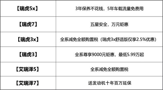 2月1日至2月28日活動(dòng)期間,奇瑞艾瑞澤5、瑞虎5x、瑞虎7等全系車型鉅惠讓利,攜多重豪禮給您拜年!億元豪禮狂歡嗨購在即,您還等什么呢?趕快將新春福利帶回家吧!