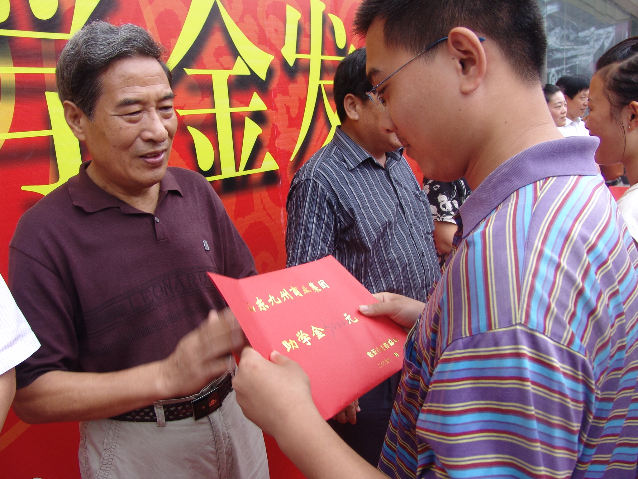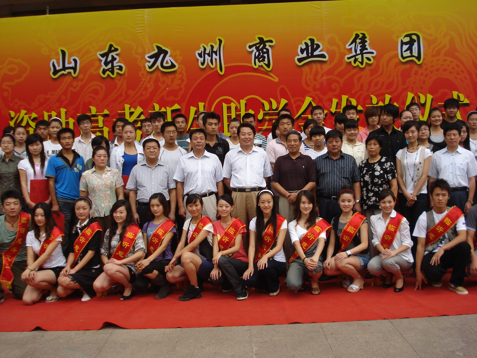 (儀式結(jié)束后領(lǐng)導(dǎo)與受助大學(xué)生合影留念) 8月25日上午,集團在九州商業(yè)大廈前舉行山東九州商業(yè)集團資助高考新生助學(xué)金發(fā)放儀式。50名受助大學(xué)生每人獲得了3000元的九州商業(yè)集團助學(xué)金。市總工會黨組副書記、副主席王向群,市總工會黨組成員、副調(diào)研員張濤,市民政局副局長、市慈善總會副會長兼秘書長朱步君,市總工會生產(chǎn)保障部部長王秀麗,臨沂市城市形象大使姚宇,以及集團領(lǐng)導(dǎo)楊本渠、張素芬、楊沂城、王佐文等同志參加助學(xué)金發(fā)放儀式。 集團總經(jīng)理楊沂城、市總工會副主席王向群、受助大學(xué)生代表、受助大學(xué)生家長代表分別在儀式上講話。楊總在講話中表示,企業(yè)在自身不斷發(fā)展的同時,牢記報效國家、回饋社會、積極投身公益的使命,勇于承擔(dān)社會責(zé)任,熱心支持慈善事業(yè)。多年來集團積極參與各類助學(xué)、助殘、救災(zāi)、濟困等公益活動,累計捐款捐物達數(shù)百萬元,受到社會各界的一致好評。楊總說,大學(xué)生是國家寶貴的人才資源,是民族的希望、祖國的未來,肩負著全面建設(shè)小康社會、努力構(gòu)建和諧社會、實現(xiàn)中華民族偉大復(fù)興的歷史重任。楊總勉勵受助的大學(xué)生珍惜大學(xué)的美好時光,樹立遠大理想,努力學(xué)習(xí)文化知識,以知識改變命運,用優(yōu)異的成績、過硬的本領(lǐng)奉獻社會、報效祖國、建設(shè)家鄉(xiāng)。 市總工會副主席王向群在講話中首先向楊本渠董事長及九州商業(yè)集團多年來積極獻身公益事業(yè)表示了感謝。他勉勵受助的大學(xué)生珍惜大學(xué)生活,不忘社會各界的幫助,努力學(xué)習(xí),回報社會。他希望更多的企業(yè)投身到社會慈善事業(yè)中來,讓更多的弱勢群體享受到祖國大家庭的溫暖。