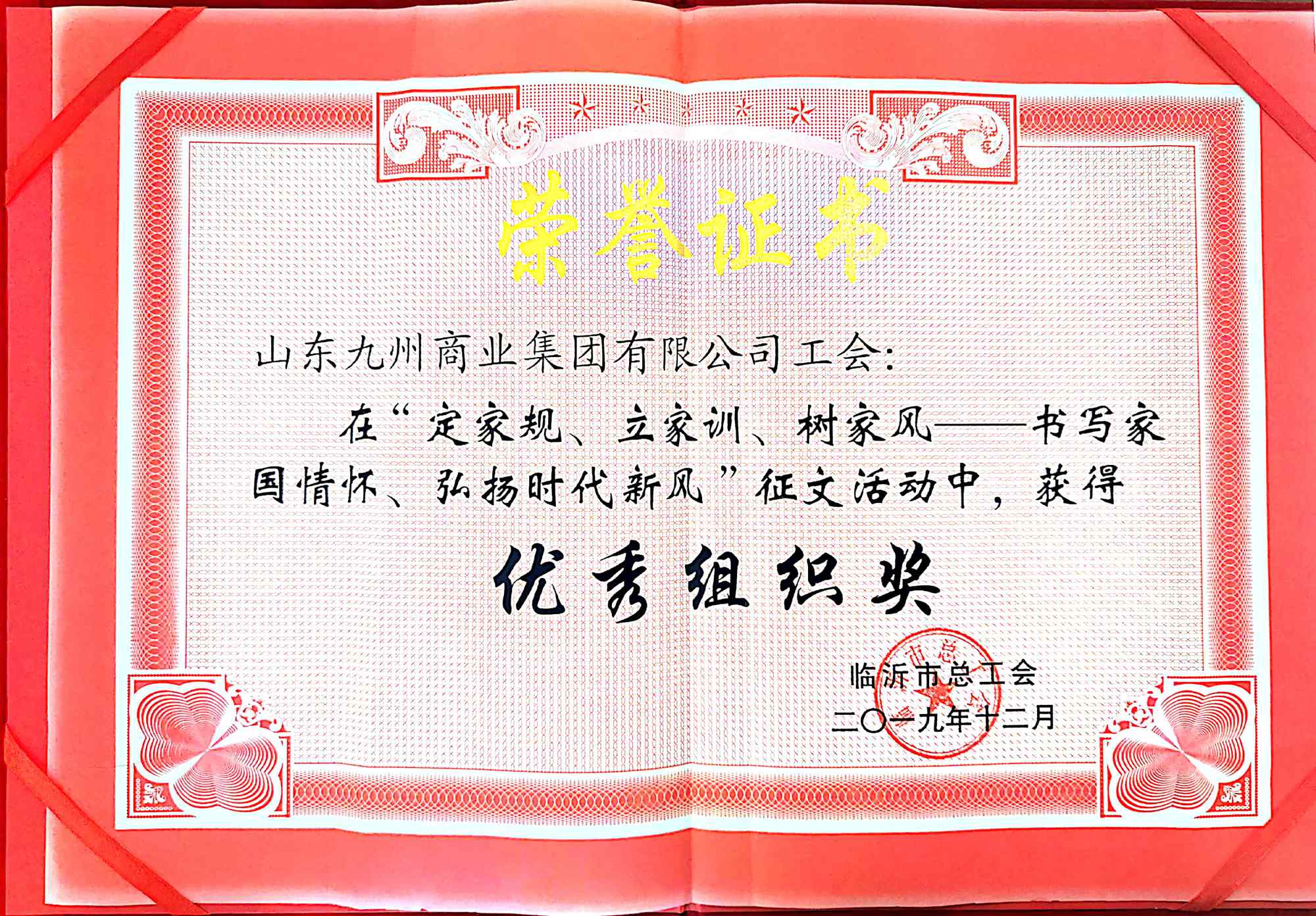 2019年12月24日,臨沂市總工會(huì)對(duì)在全市廣大女職工中開展的“定家規(guī)、立家訓(xùn)、樹家風(fēng)——書寫家國(guó)情懷、弘揚(yáng)時(shí)代新風(fēng)”活動(dòng)的獲獎(jiǎng)情況進(jìn)行了通報(bào)表彰。本次征文大賽分“我的家規(guī)家訓(xùn)故事”和“一封家書傳親情說(shuō)家風(fēng)”兩大主題。九州集團(tuán)女職工在本次征文大賽中表現(xiàn)突出,共獲一等獎(jiǎng)1個(gè)、三等獎(jiǎng)2個(gè)、優(yōu)秀獎(jiǎng)11個(gè),集團(tuán)工會(huì)榮獲“優(yōu)秀組織獎(jiǎng)”。 李金衛(wèi)的作品《給兒子的一封信》在“一封家書傳親情說(shuō)家風(fēng)”主題征文中榮獲一等獎(jiǎng)。作者充滿深情地道出撫養(yǎng)教育孩子成長(zhǎng)的辛苦歷程,既有對(duì)往事的回憶感慨,也有對(duì)未來(lái)的熱切期待,字里行間透露出一位母親對(duì)孩子深沉的愛(ài)。樸素的文字道出了教育的真諦,讀來(lái)令人受益匪淺。 本次征文大賽活動(dòng),集團(tuán)工會(huì)高度重視,精心組織,發(fā)動(dòng)集團(tuán)各單位女職工踴躍參加,共收到投稿230余篇,精選了68篇優(yōu)秀作品予以選送。市總工會(huì)特為企業(yè)作一專集,在齊魯工會(huì)平臺(tái)進(jìn)行展示,并通過(guò)微信沂蒙公眾號(hào)逐篇進(jìn)行展示。市總工會(huì)授予集團(tuán)工會(huì)等35家企事業(yè)單位工會(huì)“優(yōu)秀組織獎(jiǎng)”榮譽(yù)稱號(hào)。 講家庭故事,傳親情家書。活動(dòng)的開展激勵(lì)著我們進(jìn)一步樹立新時(shí)代家規(guī)家訓(xùn),切實(shí)推動(dòng)社會(huì)主義核心價(jià)值觀在家庭落細(xì)落實(shí),以小家庭的和諧共建大社會(huì)的和諧,為加快建設(shè)新時(shí)代“大美新”臨沂作出新的更大的貢獻(xiàn)。(集團(tuán)辦公室)