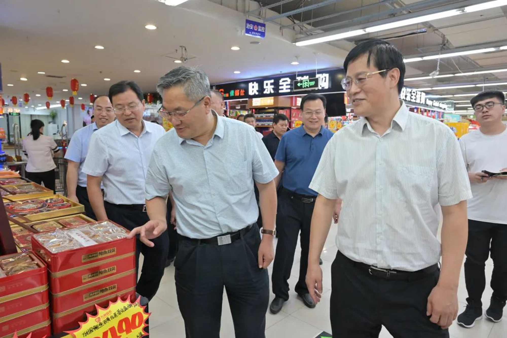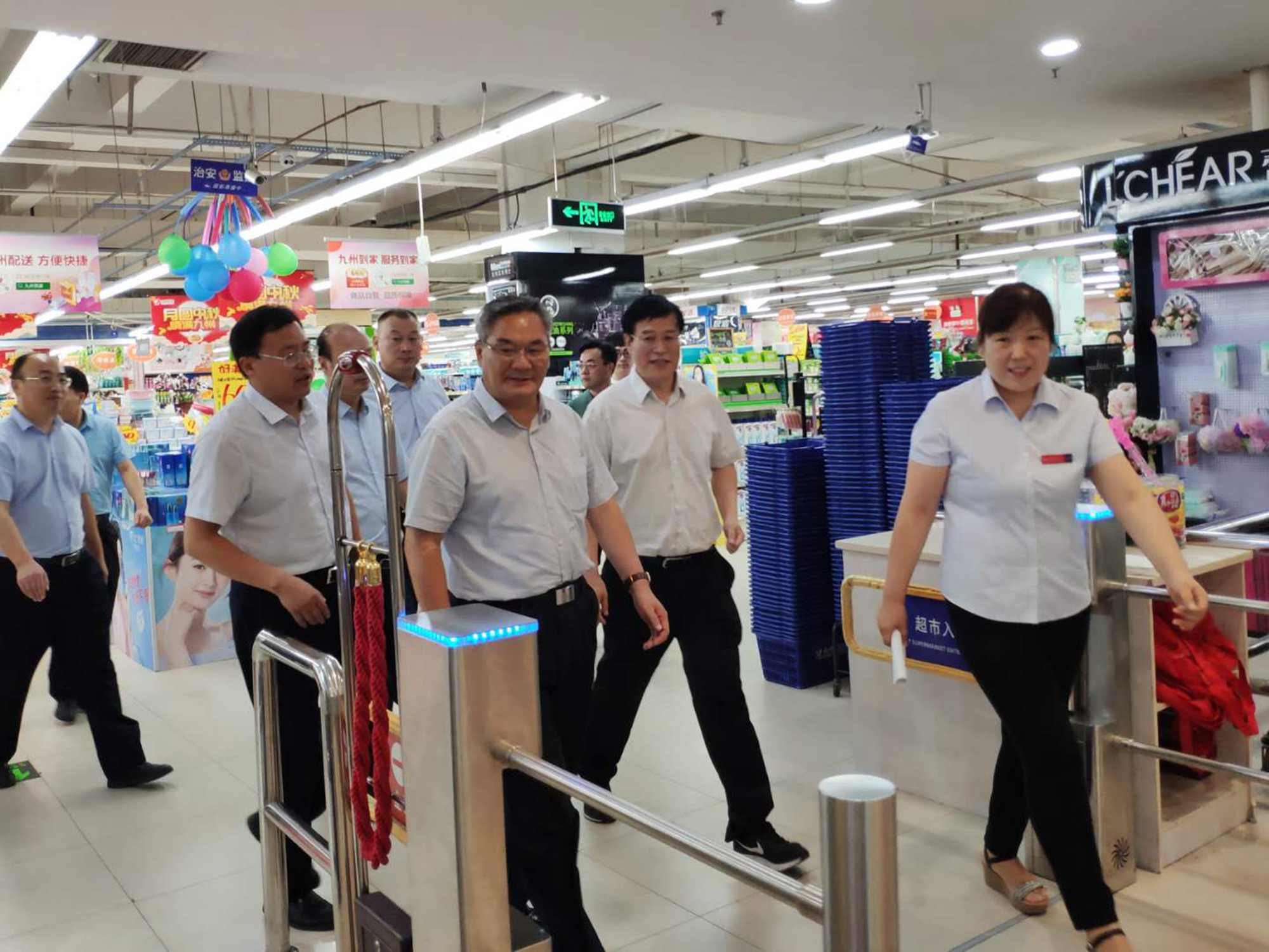 中秋國慶佳節(jié)來臨之際,9月25日上午,市政府副市長劉賢軍帶隊到九州購物中心河?xùn)|店等地檢查食品安全工作。市市場監(jiān)管局黨組書記、局長黃杰,河?xùn)|區(qū)委副書記、區(qū)長姚運明,集團(tuán)董事長、總經(jīng)理楊永東,超市公司總經(jīng)理李國等陪同。