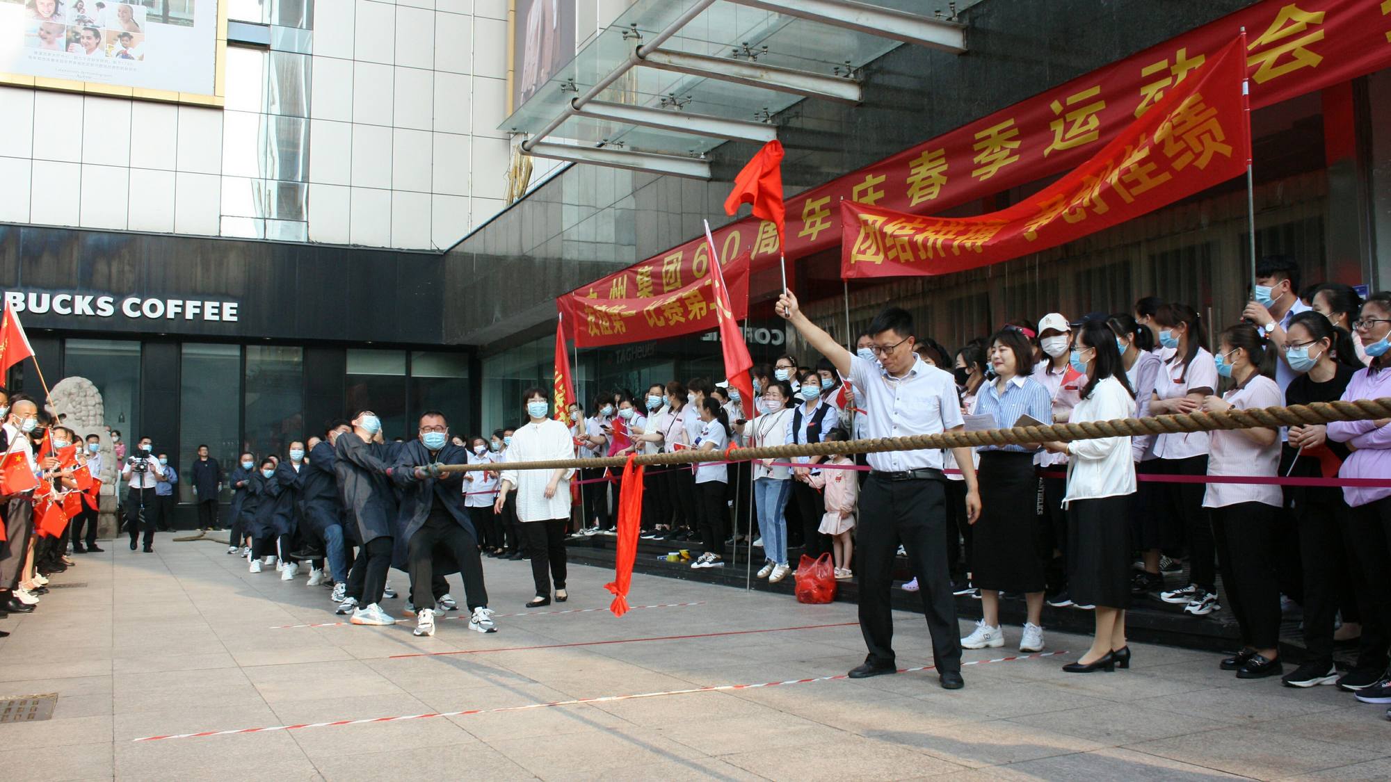 5月25日早上,九州集團(tuán)60周年慶春季運(yùn)動會拔河比賽在九州商業(yè)大廈解放路店門前廣場舉行,來自各單位和集團(tuán)行政的六支代表隊(duì)參加。本次比賽由集團(tuán)工會主辦,實(shí)行淘汰制晉級方式,抽簽分組決定比賽順序。