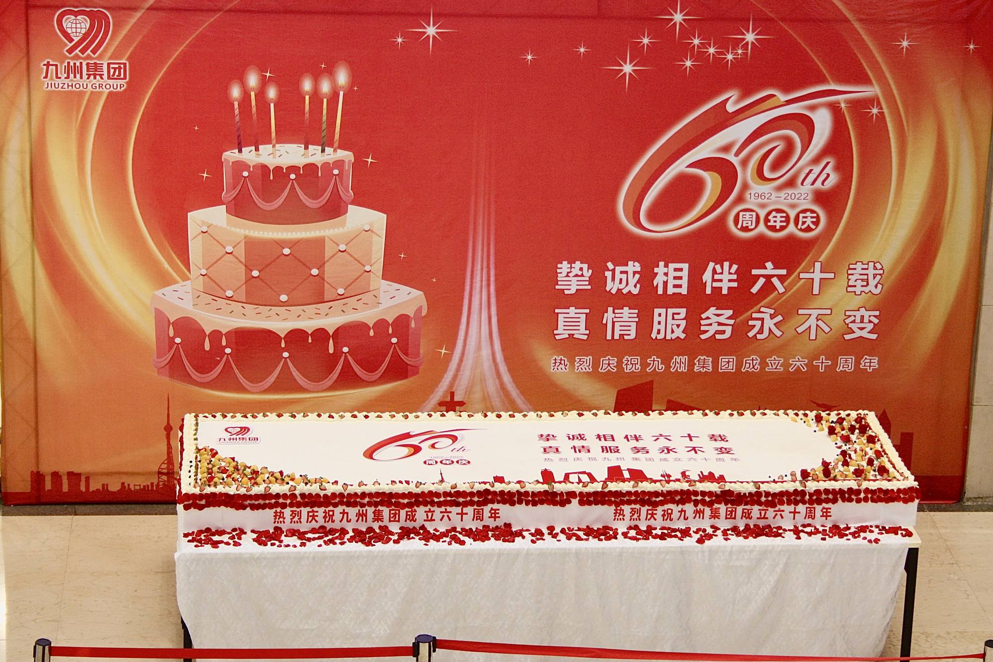 “摯誠相伴六十載,真情服務(wù)永不變!6月18日下午,九州集團(tuán)在九州商業(yè)大廈一樓中庭舉辦60周年慶巨型蛋糕齊分享活動。