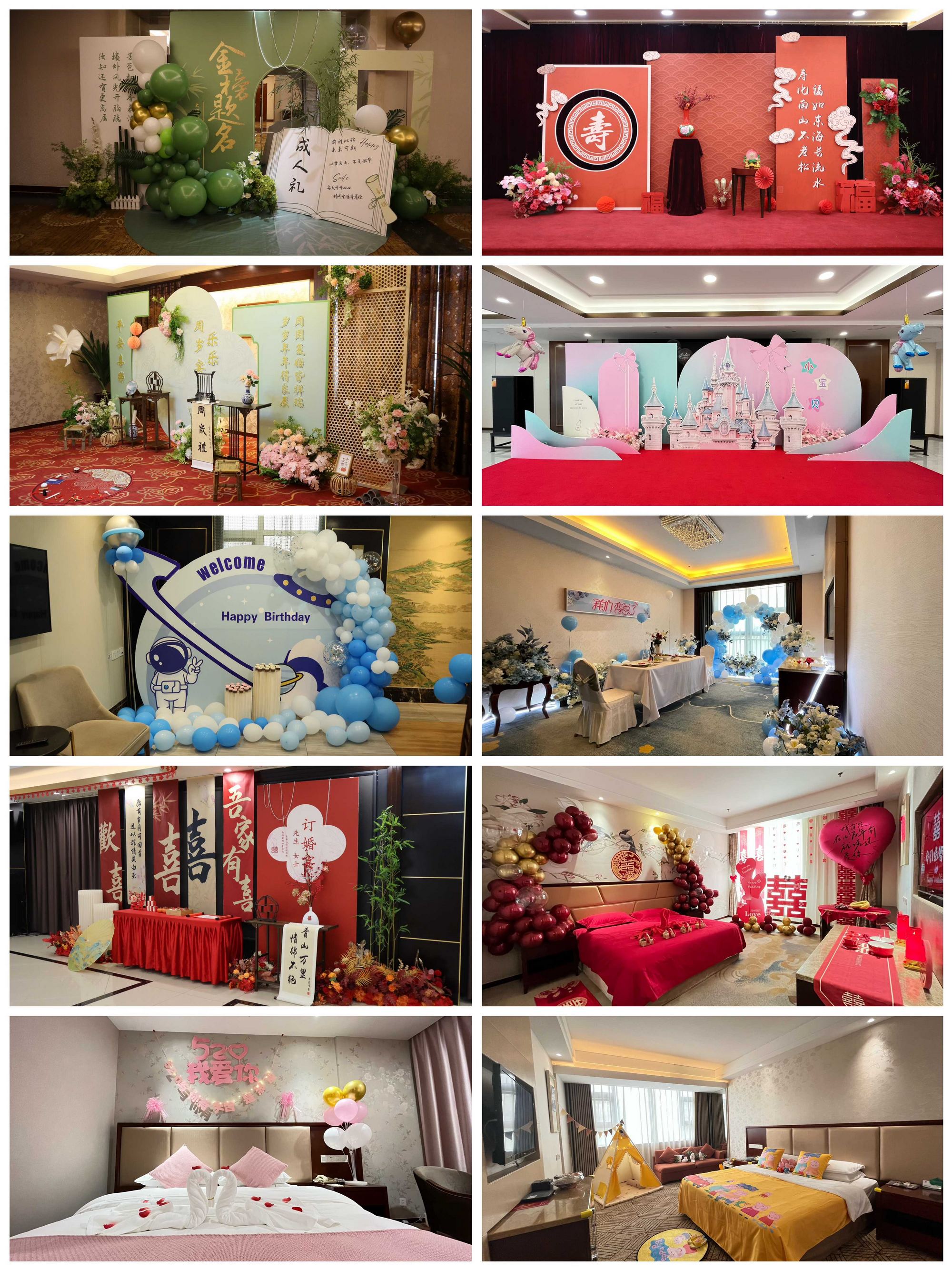 比賽中,各部位根據(jù)房型、宴會(huì)類型等設(shè)計(jì)出了不同場景布置主題。在客房場景上分別設(shè)計(jì)布置了滿足家庭出游需要的“陽光親子房”,浪漫、溫馨、喜慶的“鐘愛一生”發(fā)嫁房,充滿愛意的“傾城之戀”“鐘愛一生”情侶房。在用餐場景上分別以寶寶周歲、兒童生日為切入點(diǎn)設(shè)計(jì)了“掌中寶”和“未來可期”主題包間場景;以寶寶宴、壽宴為思路打造了“夢幻城堡”“松鶴延年”主題宴會(huì)廳布置;并制作了適用于升學(xué)、定親場景的“金榜題名”“永結(jié)同心”主題布置。在設(shè)計(jì)上參賽選手巧妙地融合了國潮風(fēng)、卡通風(fēng)等不同元素,呈現(xiàn)出一個(gè)個(gè)富有創(chuàng)意且充滿個(gè)性化的場景布置,場景布置充分體現(xiàn)實(shí)用性和美觀性。