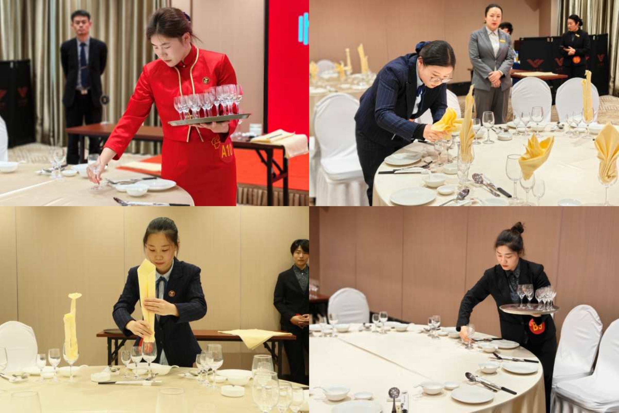本次技能比武項目為餐廳中餐宴會擺臺,比賽分為員工組和基層管理人員組,現(xiàn)場抽簽決定參賽順序,評委由臨沂賓館副總經(jīng)理、分店店總及各餐廳負(fù)責(zé)人組成。比賽中,從鋪桌布、餐碟定位、擺放餐具、餐巾折花到最后的放餐椅,選手們一氣呵成,手法嫻熟快捷、動作流暢規(guī)范。從定位精準(zhǔn)的桌布、按距離要求擺放的餐具和美觀大方的餐巾折花都透露出選手們的專業(yè)與用心,精準(zhǔn)展現(xiàn)了宴會擺臺的技藝。經(jīng)過評委綜合評比,沂蒙路店貴賓樓餐廳部丁朝陽、開發(fā)區(qū)店餐廳部陳彩霞分獲基層管理人員組和員工組第一名;周玉、薛會娜分獲基層管理人員組第二、第三名,劉雅如、房桂宇分獲員工組第二、第三名。