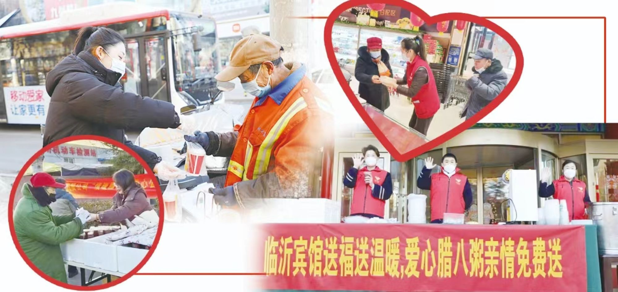 在九州超市部分門店內(nèi),工作人員熱情地為顧客遞上一碗碗熱氣騰騰的粥。汽貿(mào)公司的員工們則穿梭在街頭巷尾,將粥送到環(huán)衛(wèi)工人們手中,其中小于在送完粥后,臉上洋溢著幸福的笑容,感慨道:“看到他們喝粥時(shí)臉上綻放的笑容,我這心里滿是溫暖,感覺(jué)一早上的忙碌都值了!痹诰胖菝朗硤@門口、臨沂賓館開(kāi)發(fā)區(qū)店,員工將臘八粥裝好打包,送到周邊執(zhí)勤特警、環(huán)衛(wèi)工人、過(guò)往的公交車司機(jī)和市民手里。