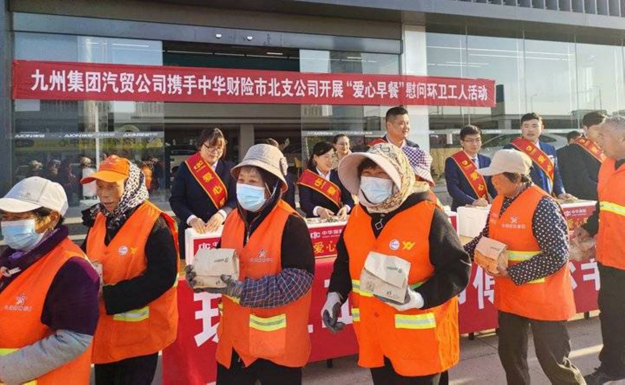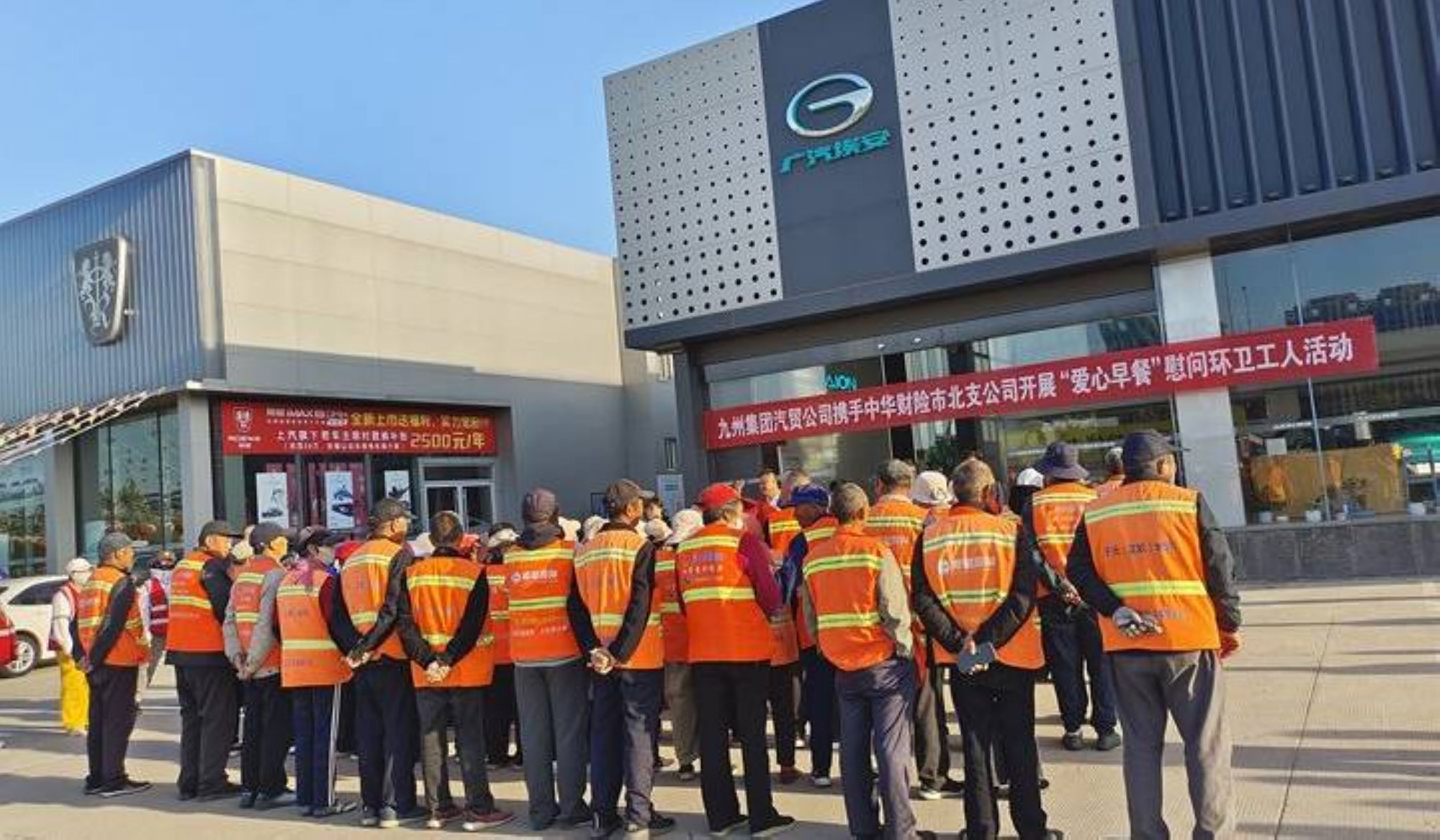 4月15日早上,九州汽貿(mào)攜手中華財(cái)險(xiǎn)市北支公司在九州埃安4S店門前廣場開展了“愛心早餐”慰問環(huán)衛(wèi)工人活動(dòng),為“喚醒城市的美容師”送上了春日清晨的第一份溫暖。