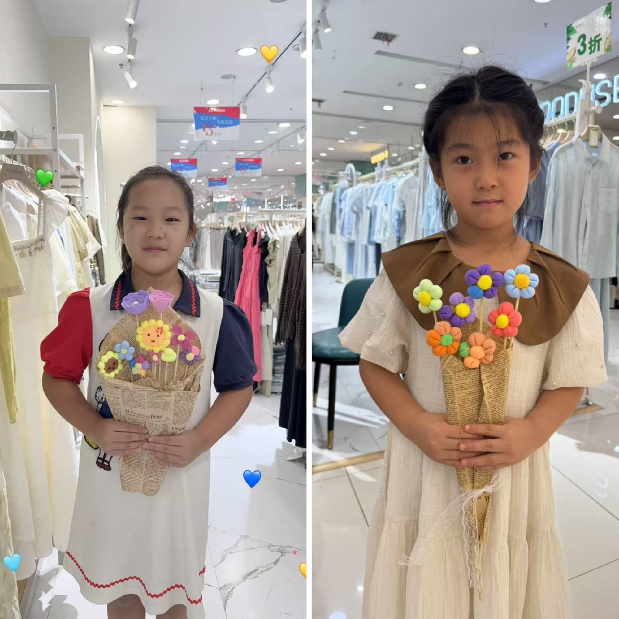 活動現(xiàn)場, CGFUSHI 女裝店長孫良梅化身 “藝術導師”,從基礎花瓣揉制到花莖拼接技巧,再到花葉搭配與整體包裝, 逐步拆解粘土花束的制作要點。到場家長與孩子攜手協(xié)作,揉、捏、粘、貼間,原本普通的粘土逐漸蛻變,一朵朵 “永不凋謝”的粘土花朵在親子默契配合下成型,組合為獨具心意的花束,猶如孩子們的臉龐,燦爛又美麗。