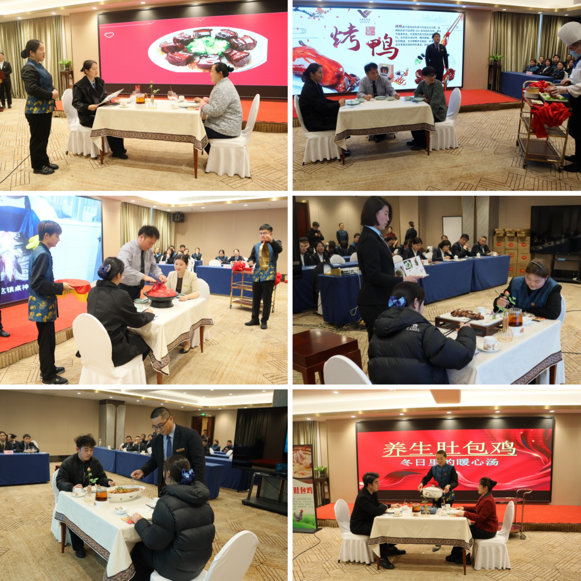 本次競賽設(shè)有必答題、搶答題和情景模擬等環(huán)節(jié);必答題環(huán)節(jié)選手按順序獨(dú)立作答,檢驗(yàn)菜品知識儲(chǔ)備;搶答題環(huán)節(jié)既要配合搶答又要熟練掌握菜品特色,節(jié)奏緊湊、你來我往,充分展現(xiàn)出比拼的激烈;情景模擬環(huán)節(jié)聚焦貴妃紅燒肉、九州烤鴨、黃燜胖魚頭、脆皮乳鴿、膠東燜魚、養(yǎng)生肚包雞等賓館招牌經(jīng)典菜,現(xiàn)場演繹服務(wù)場景、介紹菜品特色及文化,贏得陣陣掌聲。