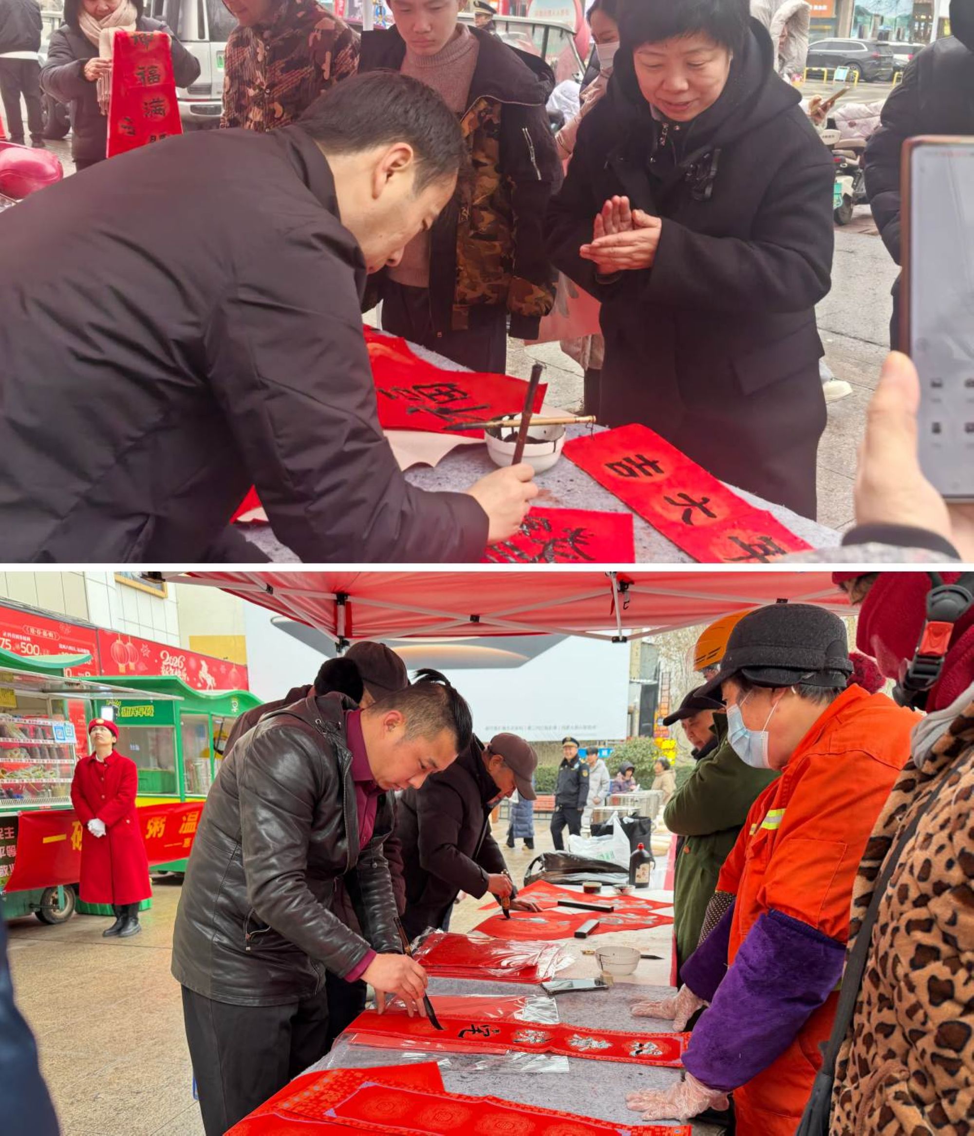在活動現(xiàn)場,一杯杯熱呼香甜的臘八粥送到環(huán)衛(wèi)工人和廣大市民手中,大家喝著熱騰騰的粥,圍在書案前欣賞著書法老師篆寫的春聯(lián)和福字,當(dāng)一幅幅福氣年味拉滿的春聯(lián)和福字送到廣大市民手中,人人臉上洋溢著燦爛的笑顏。
